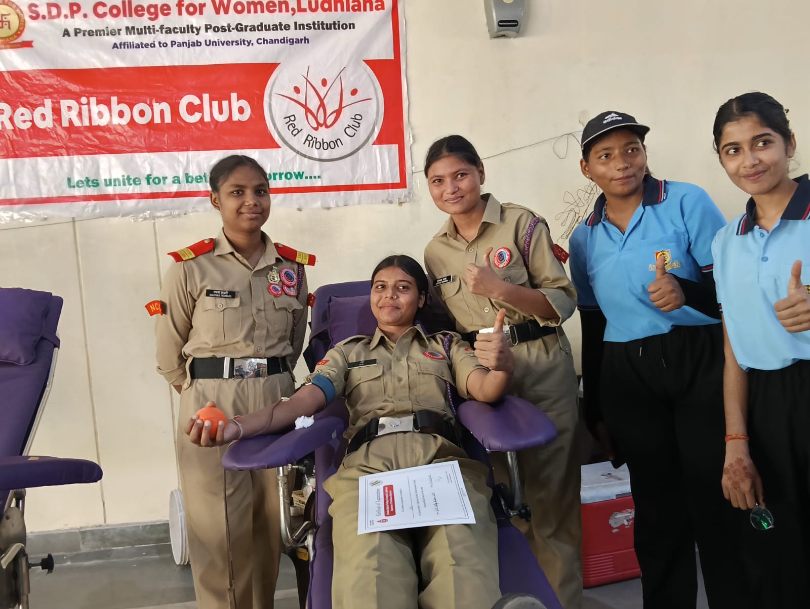 Under the supreme guidance of Sh. Balraj Kumar Bhasin, President, SDP Sabha & College Managing Committee, a Blood Donation Camp was organized by the NSS Unit and Red Ribbon Club, SDP College for Women, Ludhiana in collaboration with Bhai Ghaniya Ji Mission Sewa Society, Ludhiana. The camp was graced by the presence of Shri Taranjit Singh Nimana Ji, Head of Bhai Ghaniya Ji Mission Sewa Society, along with Shri Harpreet Singh Ji and Shri Maninder Singh Ji. Shri Nimana Ji addressed the gathering and enlightened the students about the noble mission of their Sewa Society, which is dedicated to providing blood free of cost to those in need and emphasized the promotion of selfless service. He also shared that the society has successfully organised over 900 blood donation camps across various regions. A total of 50–55 students as well as many faculty members from the college participated enthusiastically and donated blood, contributing to the spirit of humanity and service. The camp was effectively coordinated by NSS Programme Officers Ms. Sukhjinder Kaur, Ms. Reena Rani, and Ms. Preeti Narula, and Dr. Arun Prabha, Convener of the Red Ribbon Club. Principal Madam appreciated the initiative of the NSS and Red Ribbon Club for organising such a life-saving event and expressed gratitude to Bhai Ghaniya Ji Mission Sewa Society for their selfless contribution towards society.